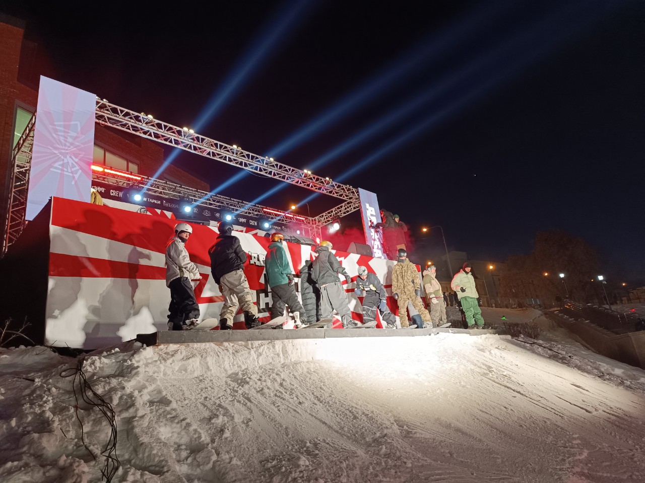 Трюки демонстрировались на скорости более 50 км в час. Для того чтобы разогнаться ещё быстрее, райдеры прыгали со сцены. Она выше от точки старта на два метра. Самые отчаянные ещё успевали делать сальто на сноуборде.