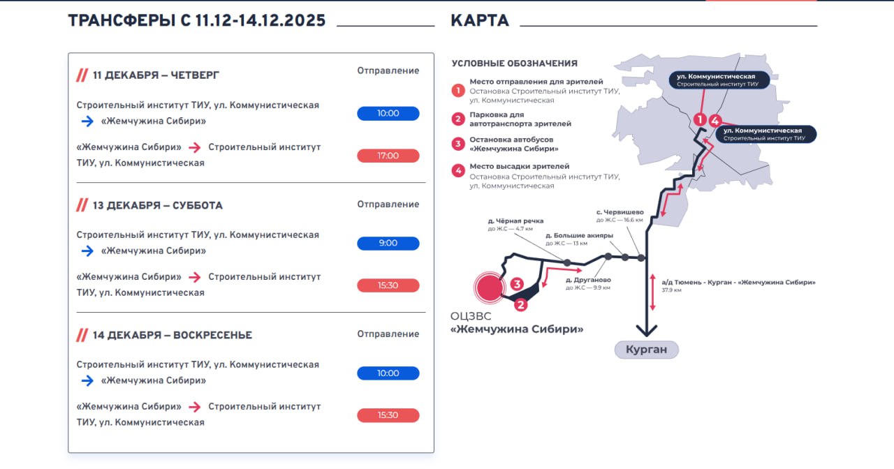 Для желающих поболеть за тюменских спортсменов организован трансфер до места проведения соревнований. Отправление из Тюмени — остановка «Строительный институт ТИУ», ул. Коммунистическая. Подробности — на сайте.