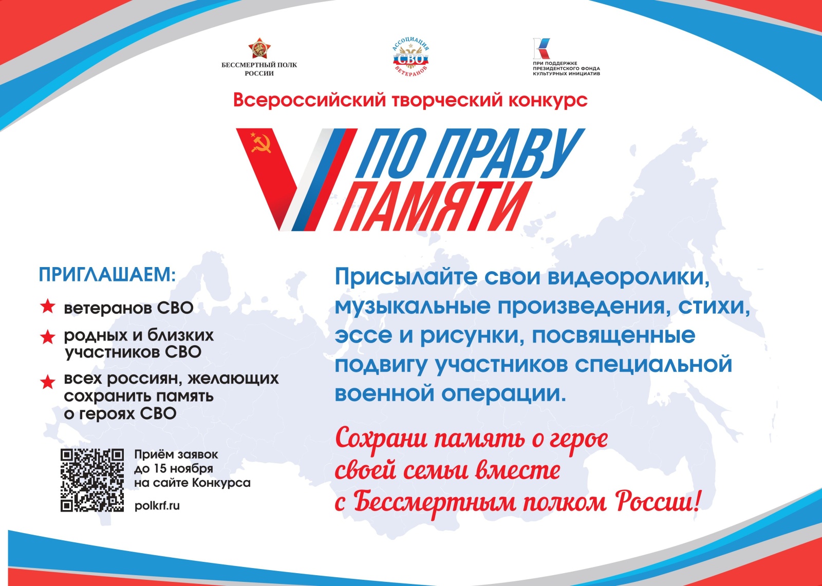 Конкурс пройдет в рамках проекта «Фестиваль творчества для участников СВО». Его организатором является движение «Бессмертный полк России» при поддержке Президентского фонда культурных инициатив.