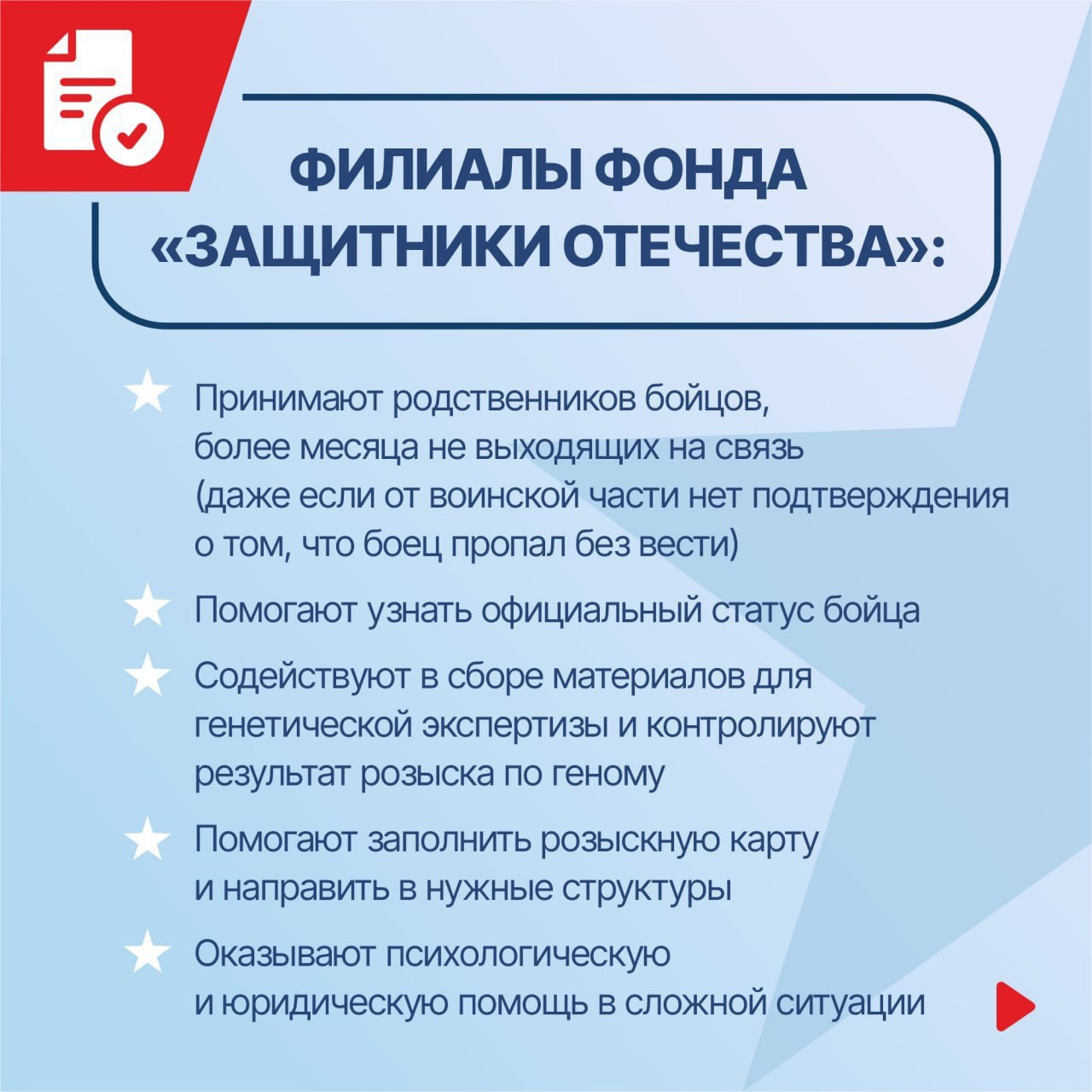 Родственники участников СВО могут обратиться в фонд, сдать генетический материал и заполнить специальную розыскную анкету. Для этого не требуется официальное признание бойца без вести пропавшим — достаточно, чтобы с ним не было связи более месяца.