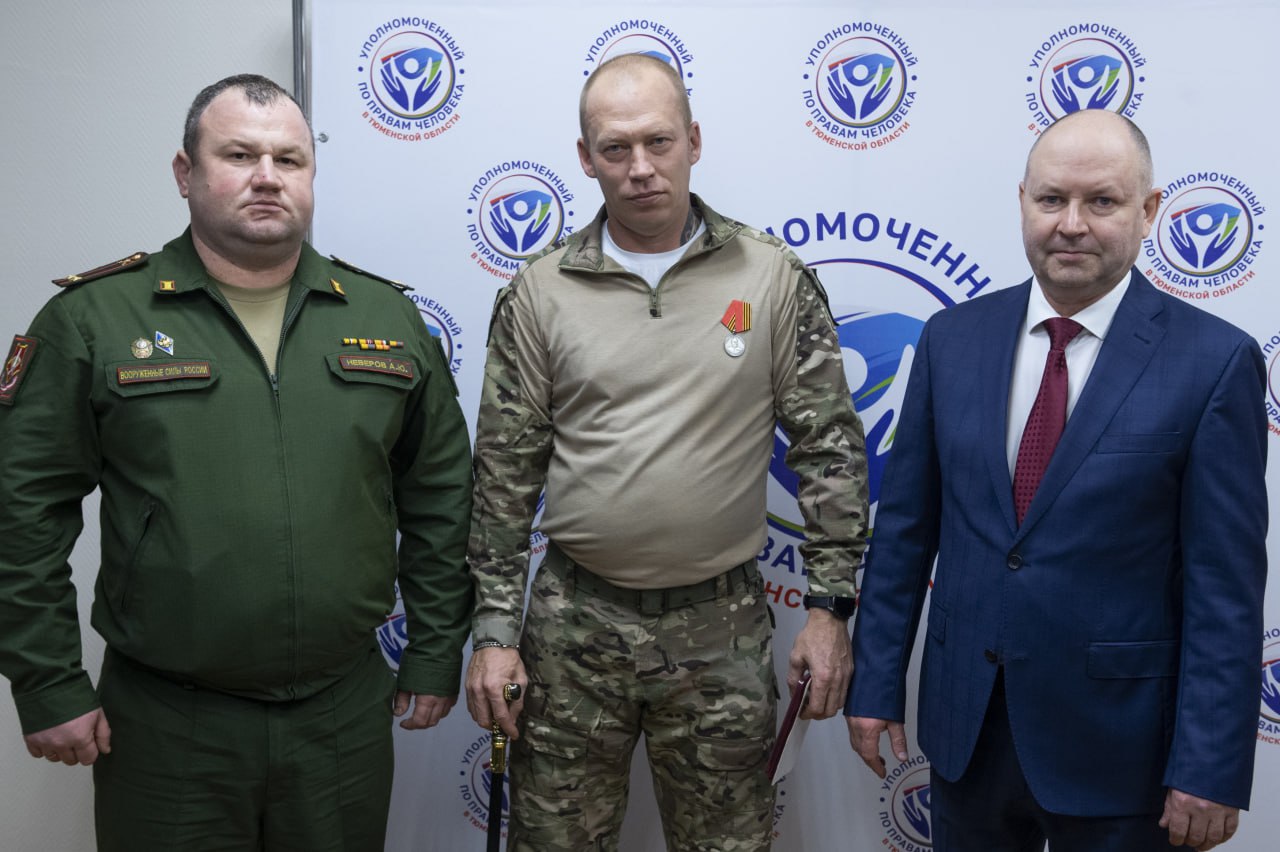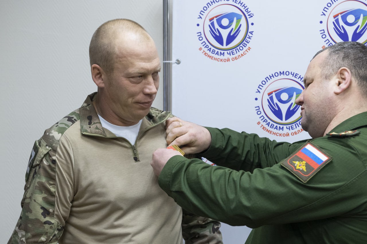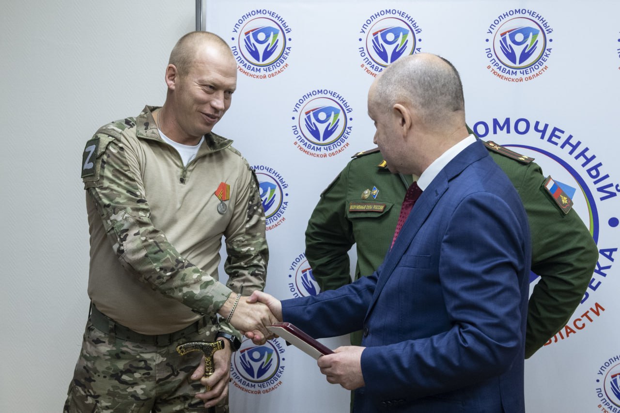 Уполномоченный по правам человека в Тюменской области Олег Датских и заместитель военного комиссара Тюменской области Алексей Неверов вручили бойцу награду, сообщает инфоцентр регионального правительства.