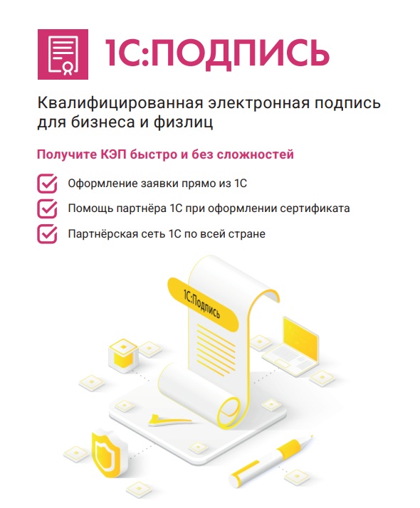 Еще эффективнее сервис «1С-ЭДО» работает вместе со своим «помощником» — приложением «1С:Подпись» для получения сертификата усиленной квалифицированной электронной подписи от удостоверяющего центра ООО «НПЦ 1С». Наличие такой подписи — обязательное условие для обмена юридически значимыми документами. Кроме того, ее можно использовать для отправки регламентированной отчетности в контролирующие органы и работы с государственными информационными системами.