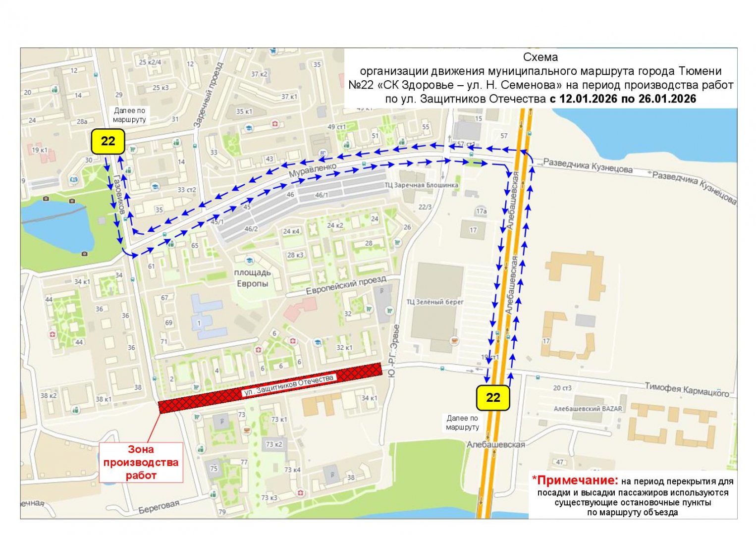 С 12 по 26 января 2026 года в связи с выполнением работ по ул. Защитников Отечества в районе перекрестка с ул. Газовиков маршрут №22 будет следовать в объезд перекрытого участка со всеми существующими остановочными пунктами по маршруту объезда.