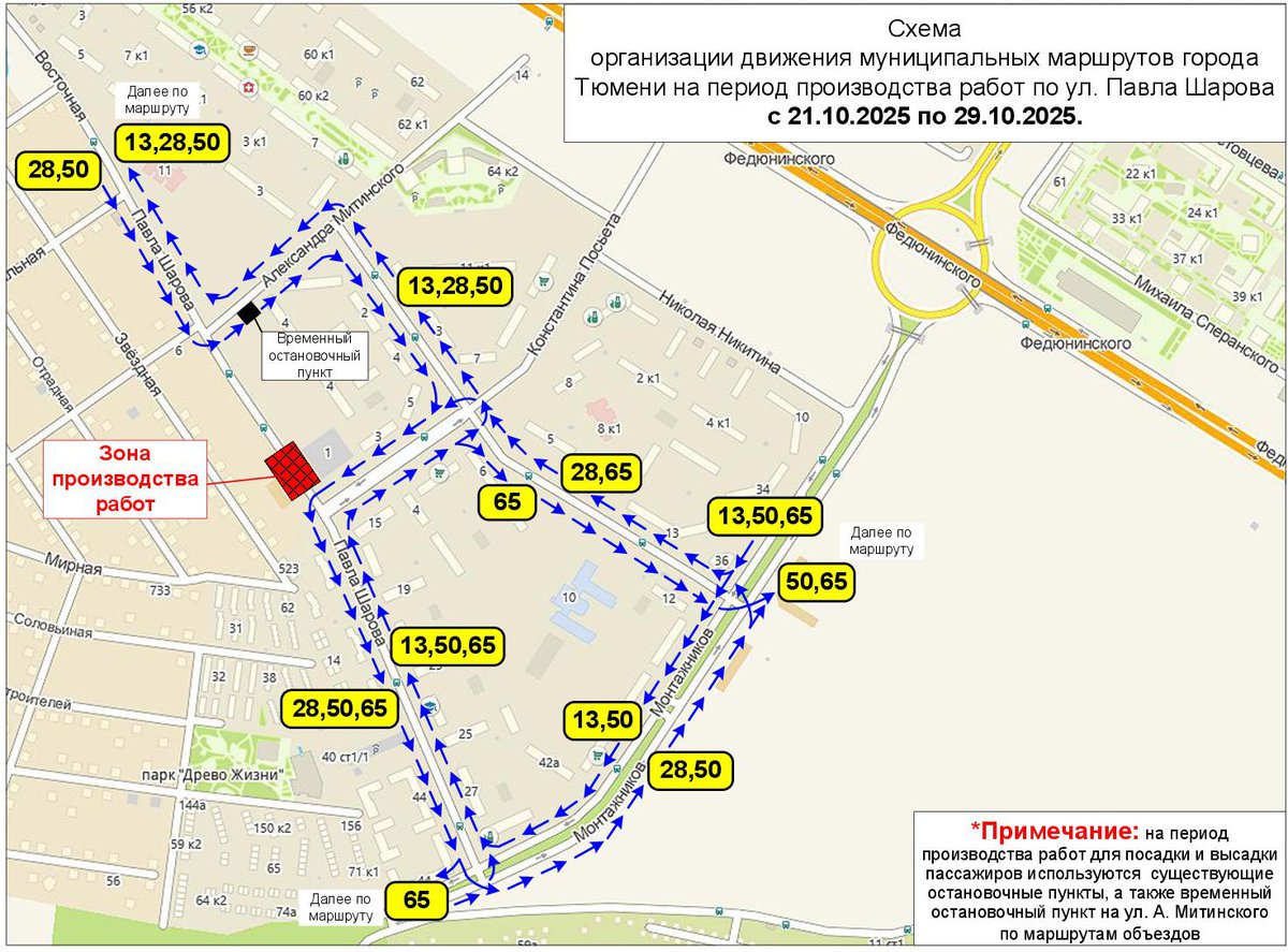 Маршруты №№13, 28, 50, 65 будут следовать в объезд. Временная остановка появится на улице Александра Митинского. Расписание для пассажиров доступно на сайте tgt72.ru, в мобильном приложении «Тюменский транспорт», по бесплатному номеру телефона информационно-справочной службы МКУ «Тюменьгортранс»: 8-800-250-07-22.