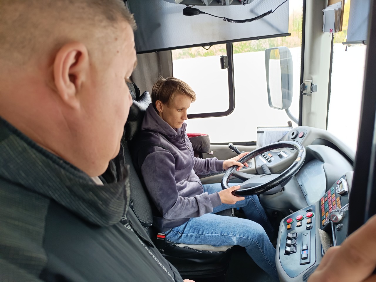 Задание несложное, главное — разобраться с кнопками и педалями. Под присмотром инструктора нужно тронуться с места и проехать по кругу, обозначенному конусами. Первый опыт у всех положительный. Тюменки выходят из автобуса счастливые: глаза горят, все хотят учиться на категорию «D».