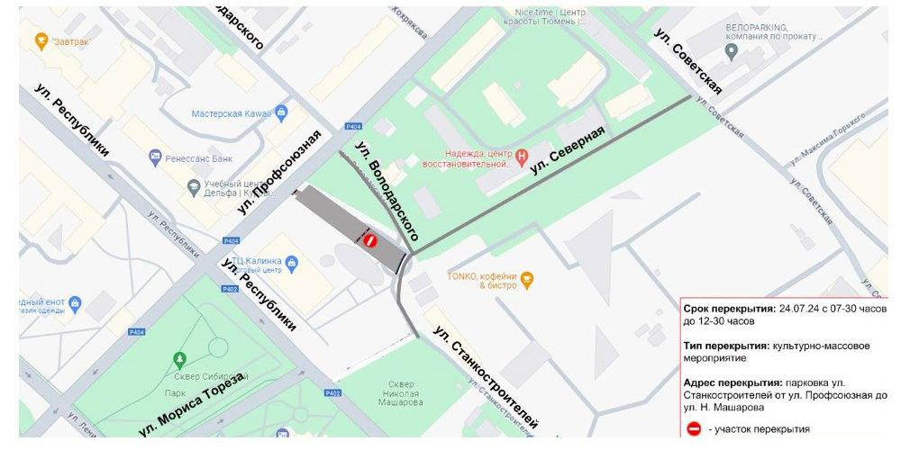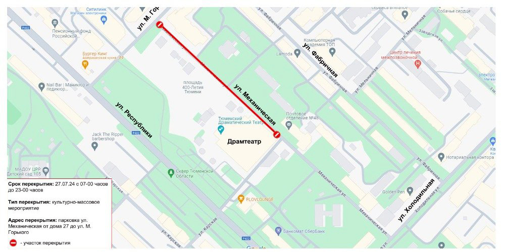 В сам День города, 27 июля, с 7 до 23 часов перекроют улицу Механическую от дома №27 до М. Горького. Площадь 400-летия Тюмени станет главной площадкой празднования.