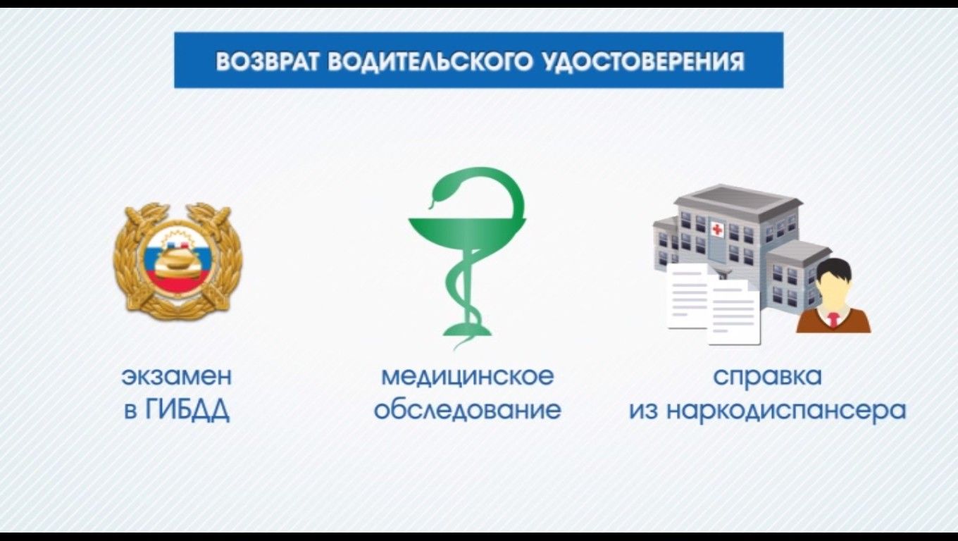 Готовиться к возврату водительского удостоверения можно только после того, как пройдет половина срока лишения. За вождение в пьяном виде водителю грозит до двух лет лишения права управления автомобилем. Получается, при максимальном наказании он может прийти в ГИБДД, спустя год, и сдать теоретическую часть экзамена на знания правил дорожного движения. Однако это лишь начало бюрократических приключений. Ведь чтобы вернуть права обратно, нужно получить справку в наркодиспансере.