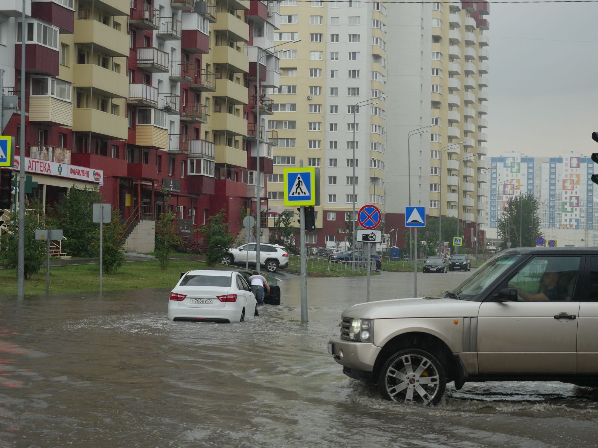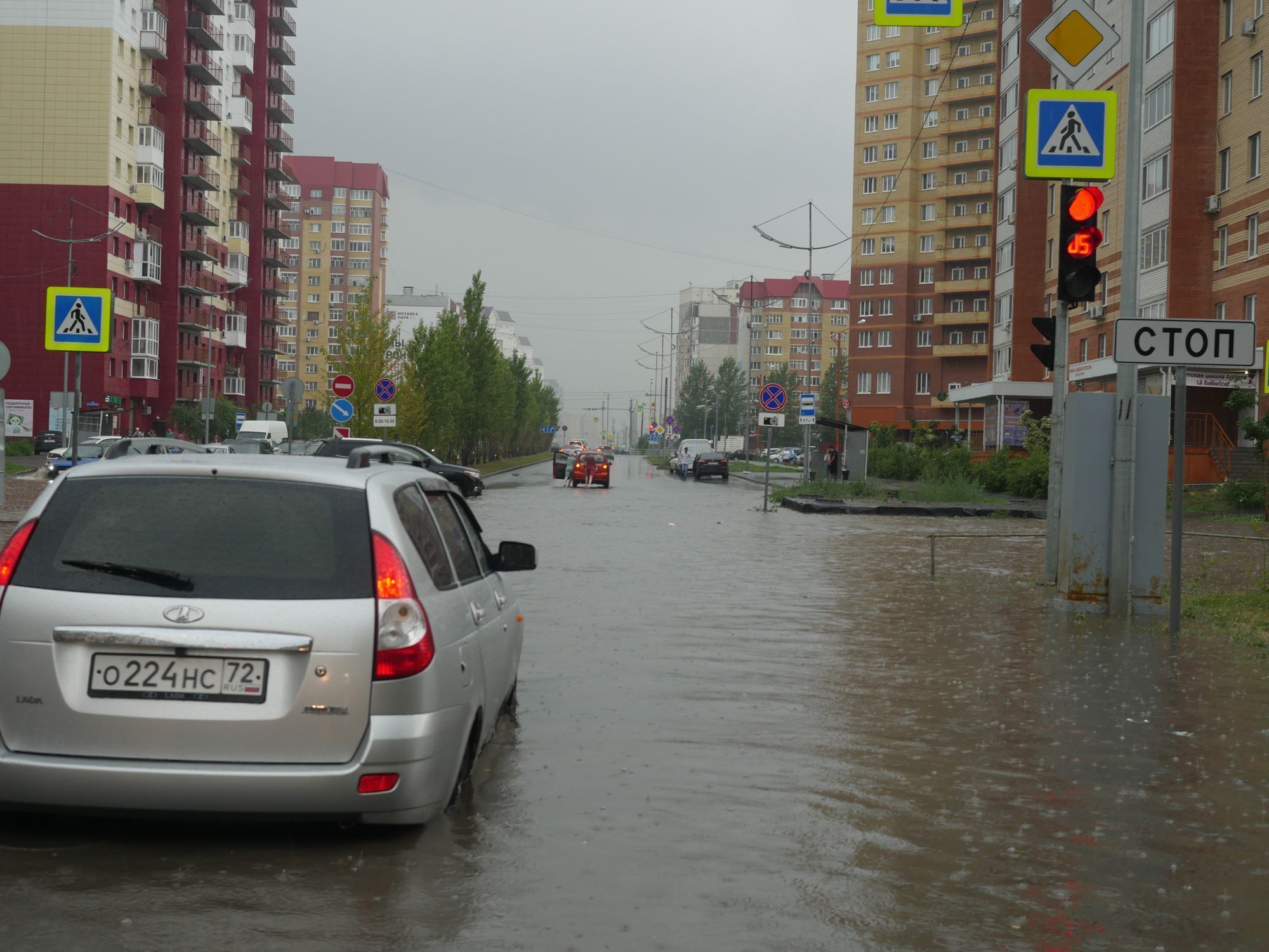На перекрестке улиц Прокопия Артамонова и Гольцова оказался в воде после сегодняшнего ливня. Глубина доходила до колена. Пешие тюменцы не могли перейти дорогу на зеленый сигнал светофора, а водители на легковых автомобилях с большим трудом преодолевали брод.