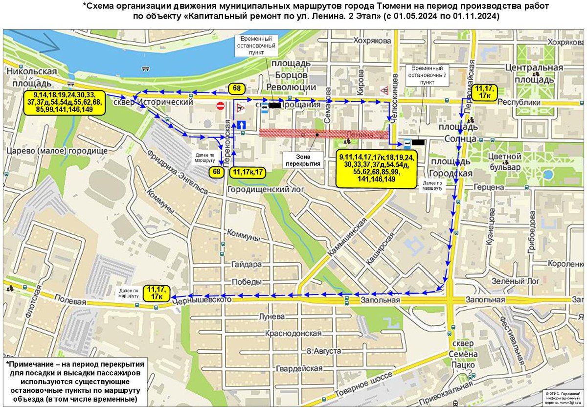 Общественный транспорт будет ходить в объезд по улицам Республики, Первомайской и Запольной, смотрите схему. Если появятся вопросы — можно обратиться в «Тюменьгортранс» по контактам выше.