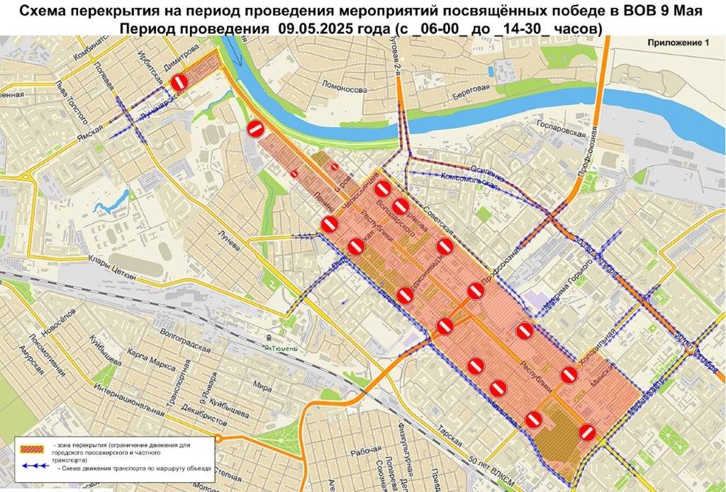 Первое — с 6.00 до 14.30, когда пройдет шествие «Бессмертного полка». Будут закрыты улицы Республики и Ленина от Коммунистической (у строительного института ТИУ) до Мельникайте.