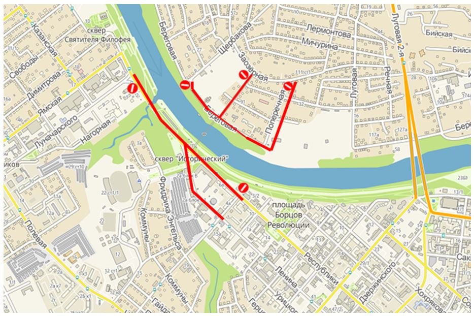 Пути объезда: ул. Семакова, ул. Красина, ул. Урицкого, ул. Поперечная, ул. Заозерная.