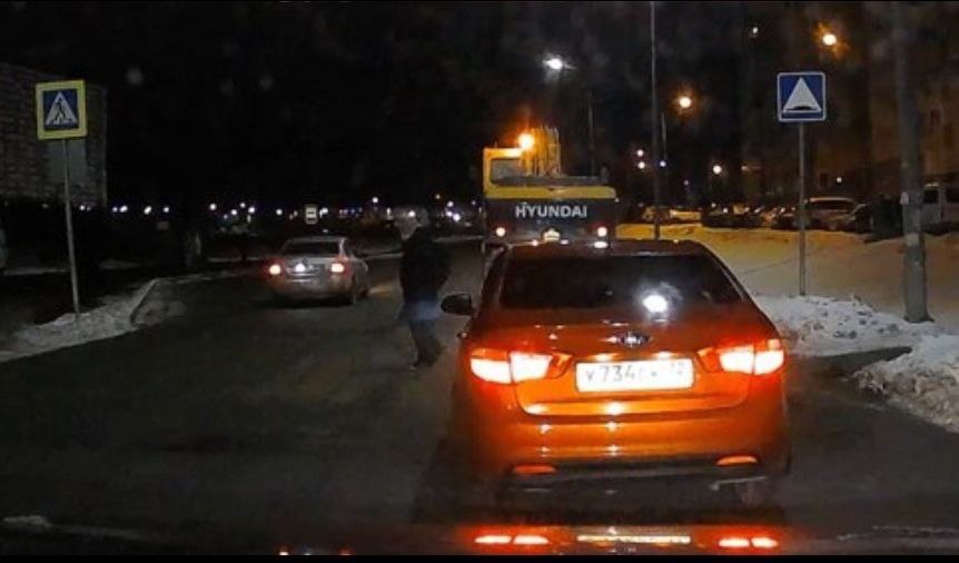 Автомобили в первом ряду остановились, чтобы пропустить женщину на «зебре». Однако по второму ряду продолжил ехать «Фольксваген». Ситуация произошла на улице Новотарманской в Тюмени.