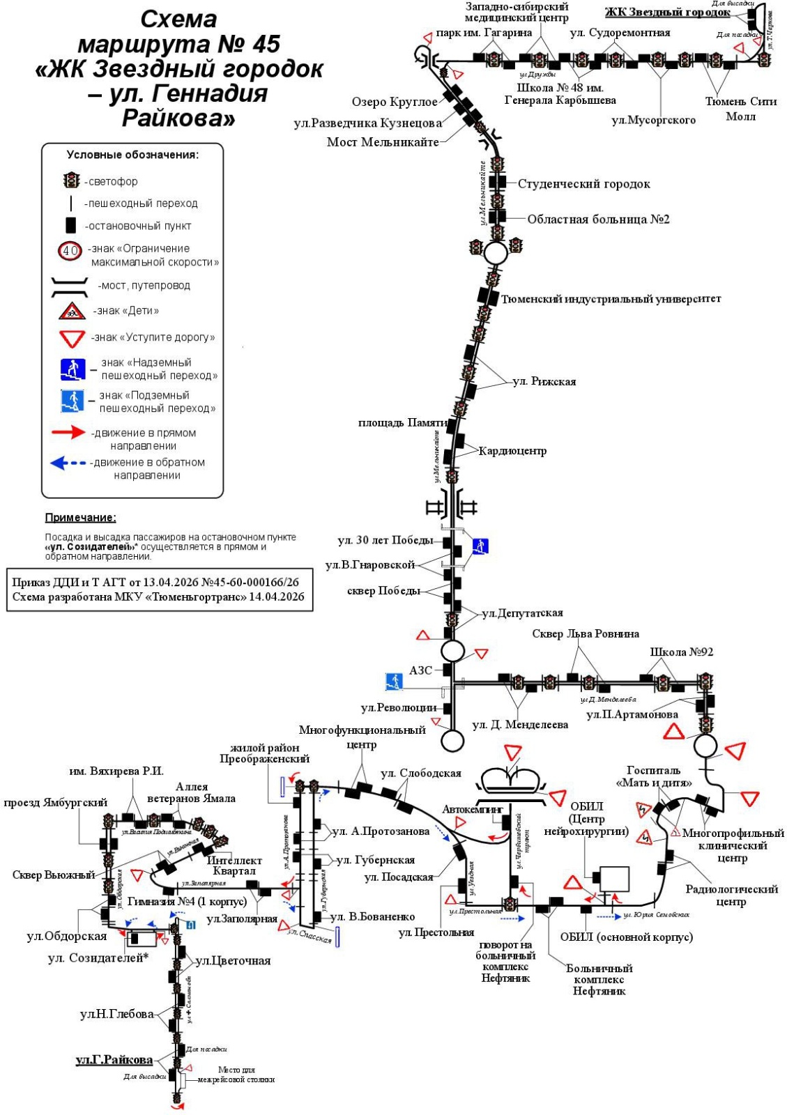 В маршрут № 45 «ЖК Звездный городок — ул. Николая Глебова» включат остановочные пункты «ул. Геннадия Райкова» в прямом и обратном направлениях. Исключат — «ул. Посадскую, «ул. Престольную» в прямом направлении.