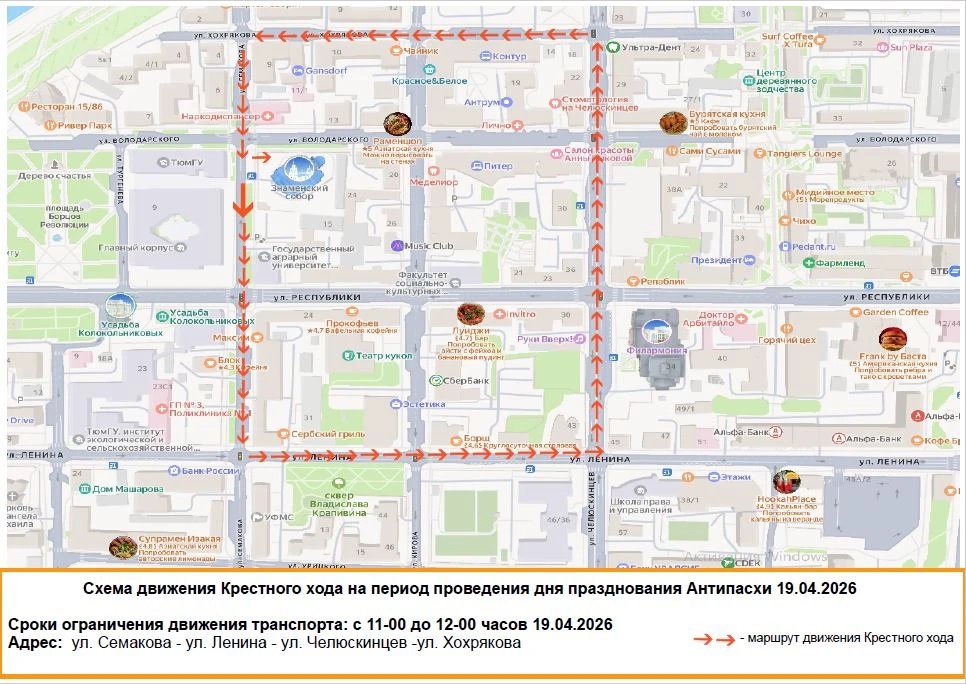 В воскресенье, 19 апреля, ожидается ограничение движения в центре Тюмени, в квадрате улиц Семакова — Ленина — Челюскинцев — Хохрякова.
