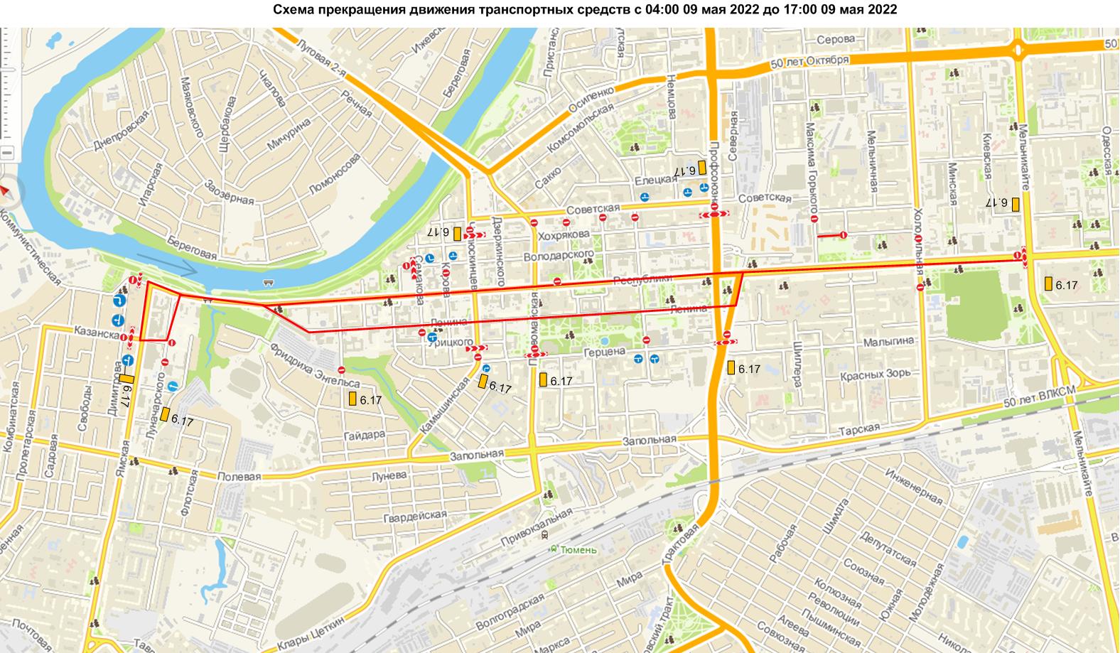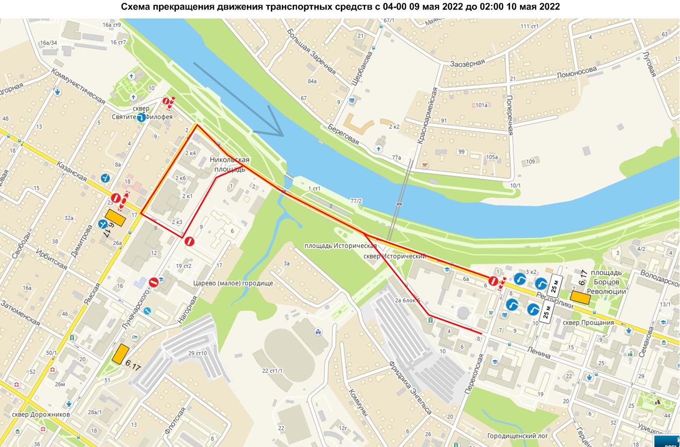 А с 4 часов 9 мая до 2 часов 10 мая будут ограничивать движение по ул. Республики на участке от ул. Перекопской до ул. Ямской;