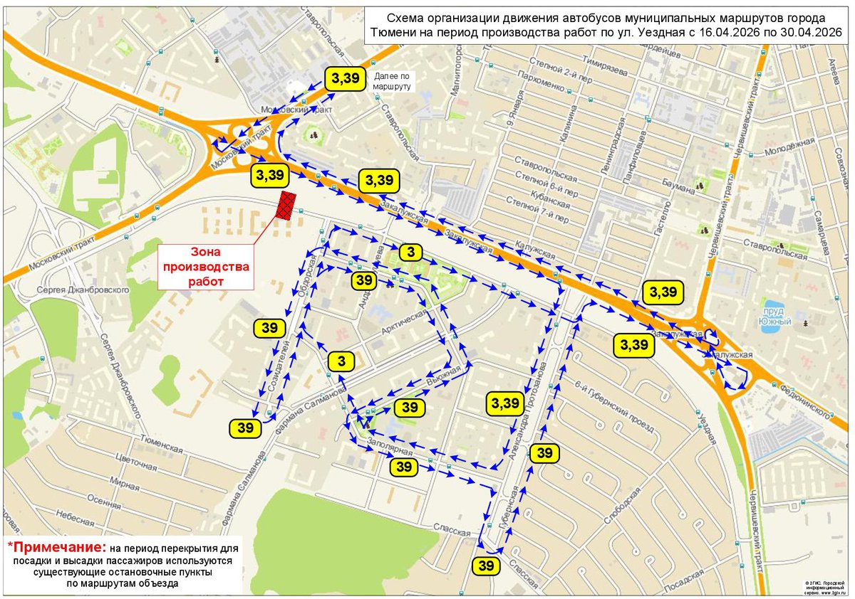 С 16 по 30 апреля улицу Уездную в Тюменской слободе перекроют для выполнения работ. По этой причине маршруты №3 и №39 временно изменят схему движения.