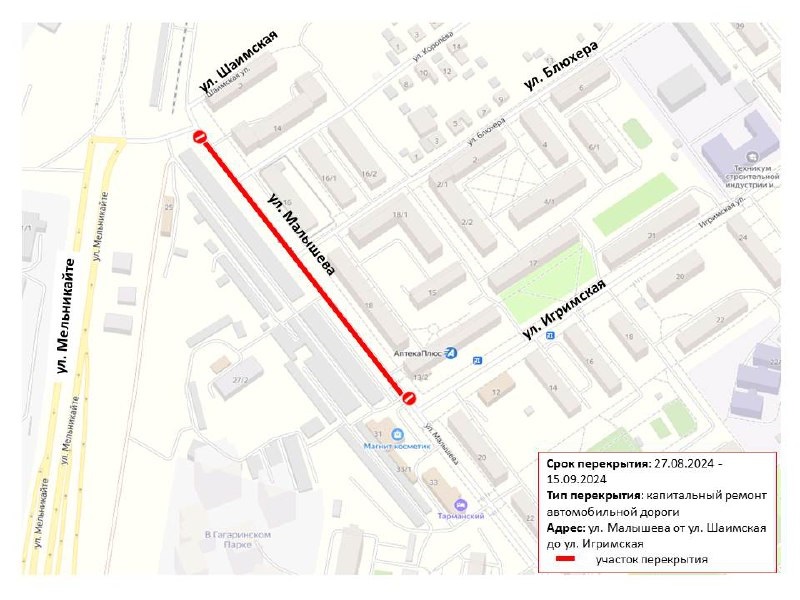 Сегодня, 27 августа, закроют улицу Малышева в Тюмени на капитальный ремонт дороги. До 15 сентября будет действовать ограничение для транспорта на участке от улицы Игримской до Шаимского. Это в районе новой транспортной развязки на Мельникайте.