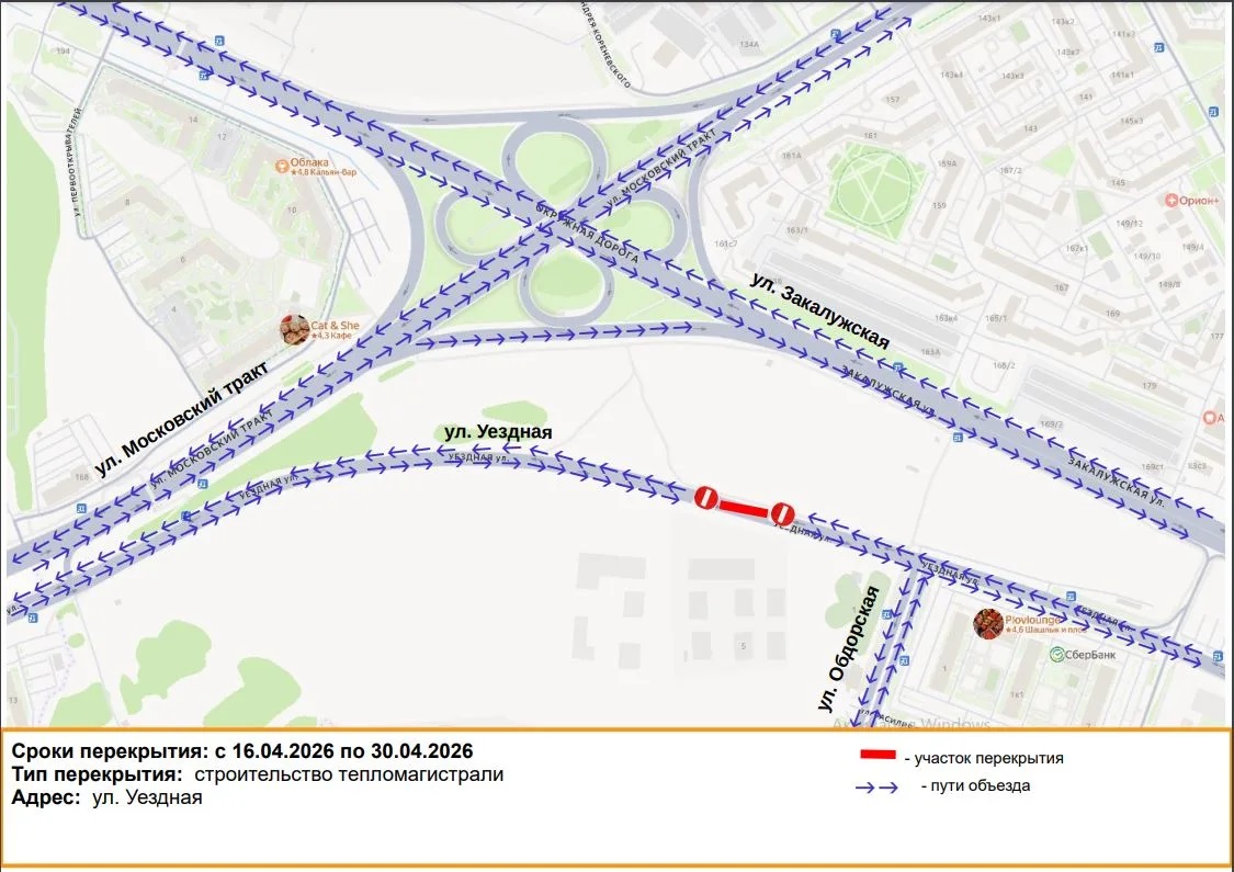 Возможные маршруты объезда — по улицам Обдорской, Закалужской, Московскому тракту, сообщает городской департамент дорожной инфраструктуры и транспорта.