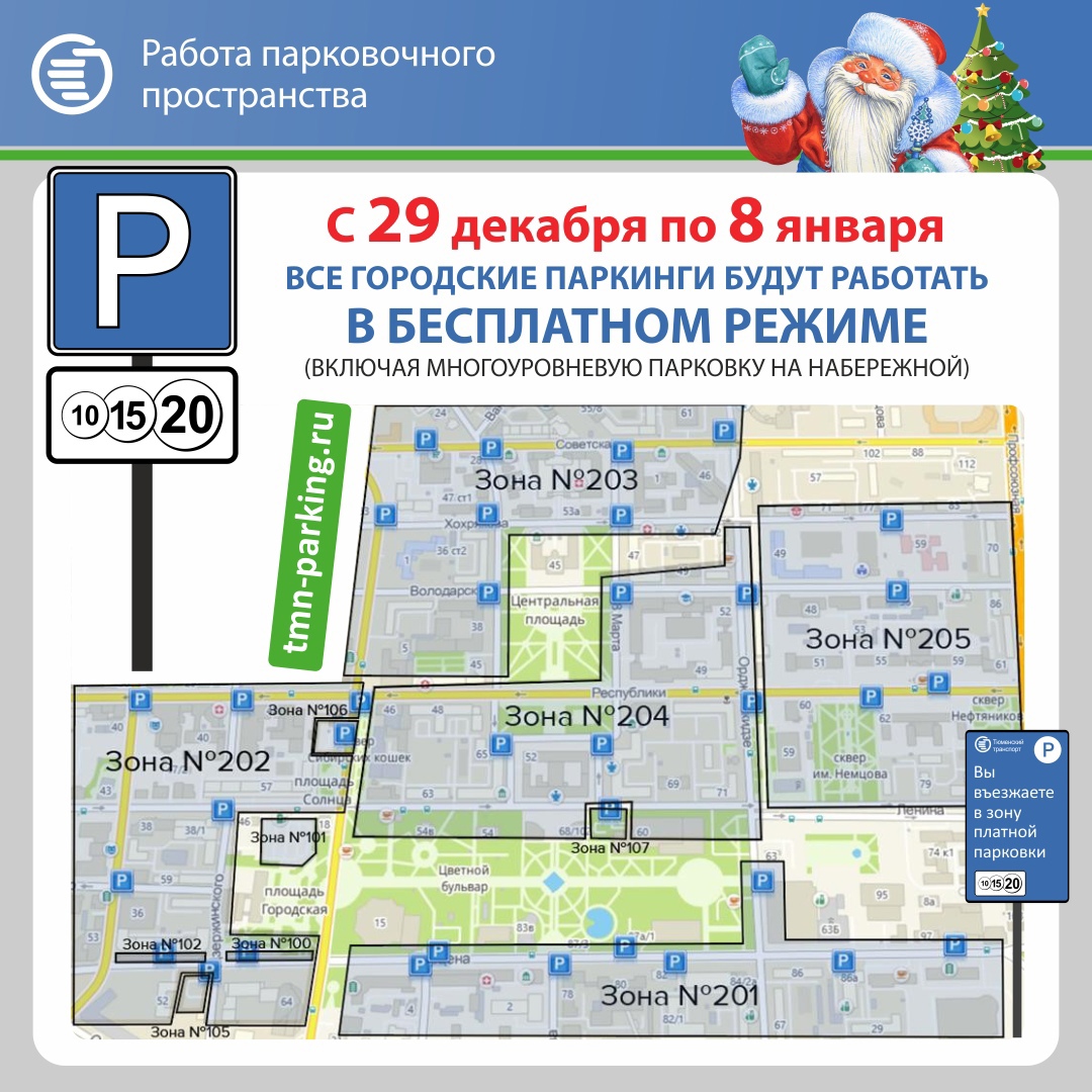 Все платные парковки Тюмени с 29 декабря по 8 января будут работать в бесплатном режиме, сообщает департамент дорожной инфраструктуры и транспорта.