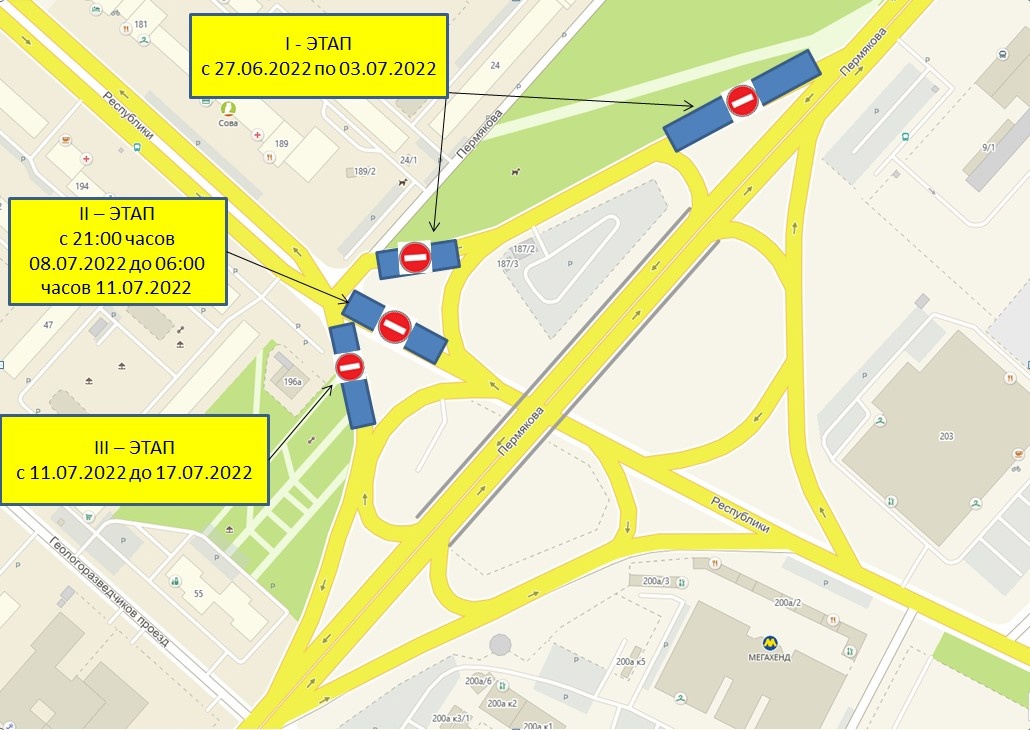 На третьем этапе движение транспорта будет прекращено на подъеме на путепровод по ул. Пермякова с ул. Республики при движении со стороны центра города Тюмени. Сроки — 11-17 июля.
