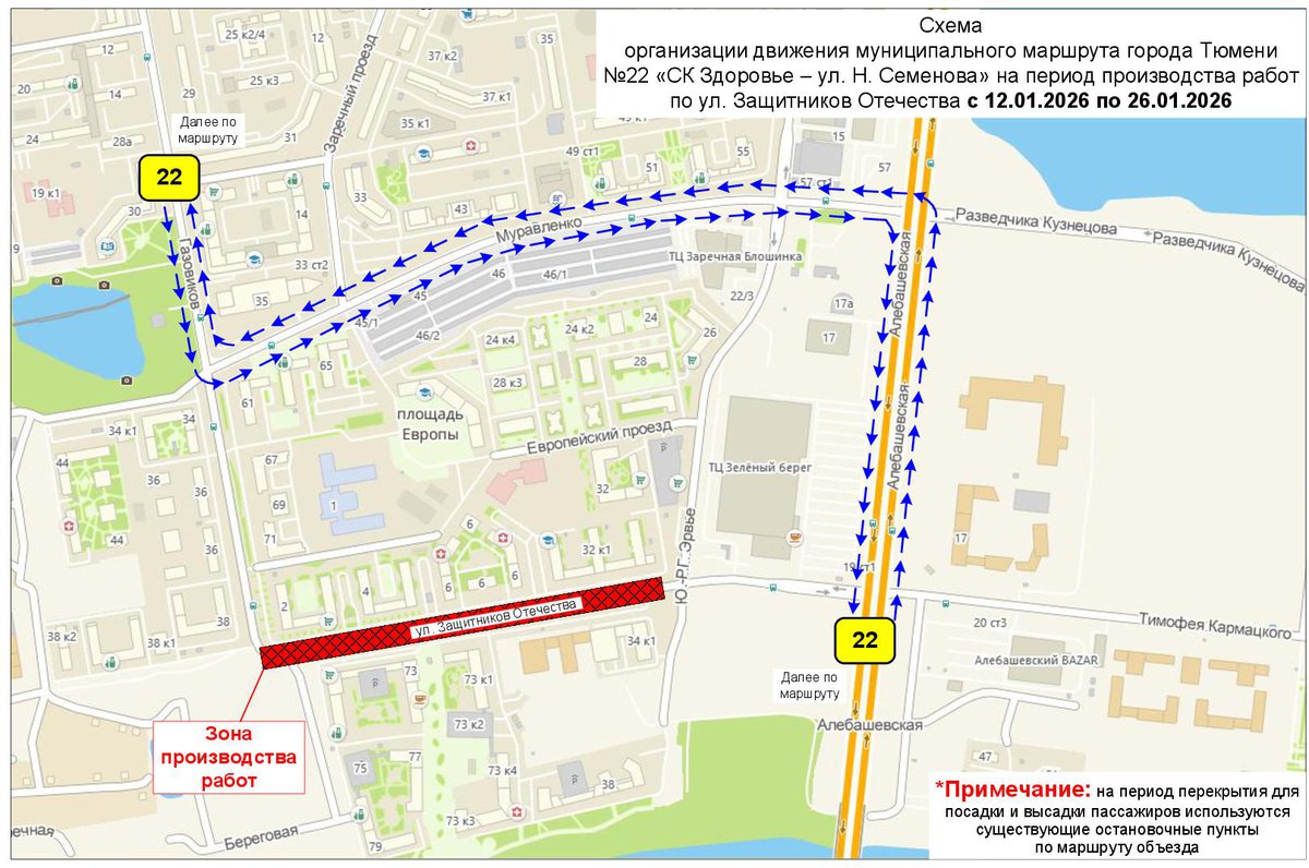 На эти две недели автобус №22 поменяет маршрут: он будет курсировать через Алебашевскую и Газовиков. Расписание для пассажиров общественного транспорта доступно на сайте tgt72.ru, в мобильном приложении «Тюменский транспорт», по бесплатному телефону информационно-справочной службы Тюменьгортранса 8-800-250-0722 и на остановках.