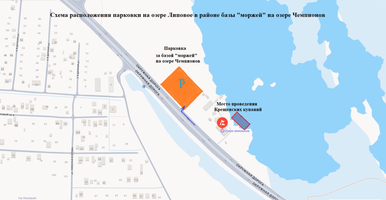 На озере Липовом, что на 25 км объездной дороги, купания пройдут 18 января с 12.00 до 23.59, 19 января — с 8.00 до 23.59. Просторная парковка разместится за территорией базы «моржей» у озера Чемпионов. Водителям помогут сориентироваться приложенные схемы.