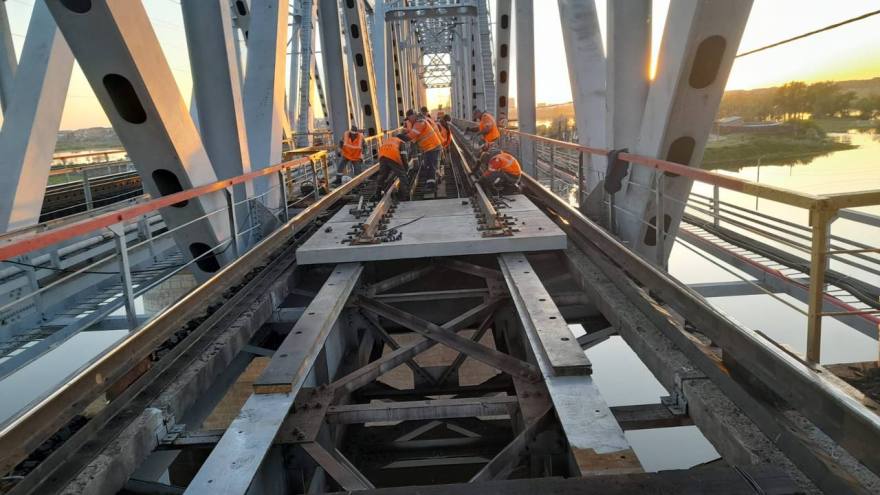 При реконструкции ж/д пути на мостовом переходе через реку Тобол на перегоне Ялуторовск — Заводоуковская ведется установка железобетонных плит безбалластного мостового полотна. В настоящее время из 106 плит уложено порядка 90, оставшуюся часть планируется выполнить зимой.